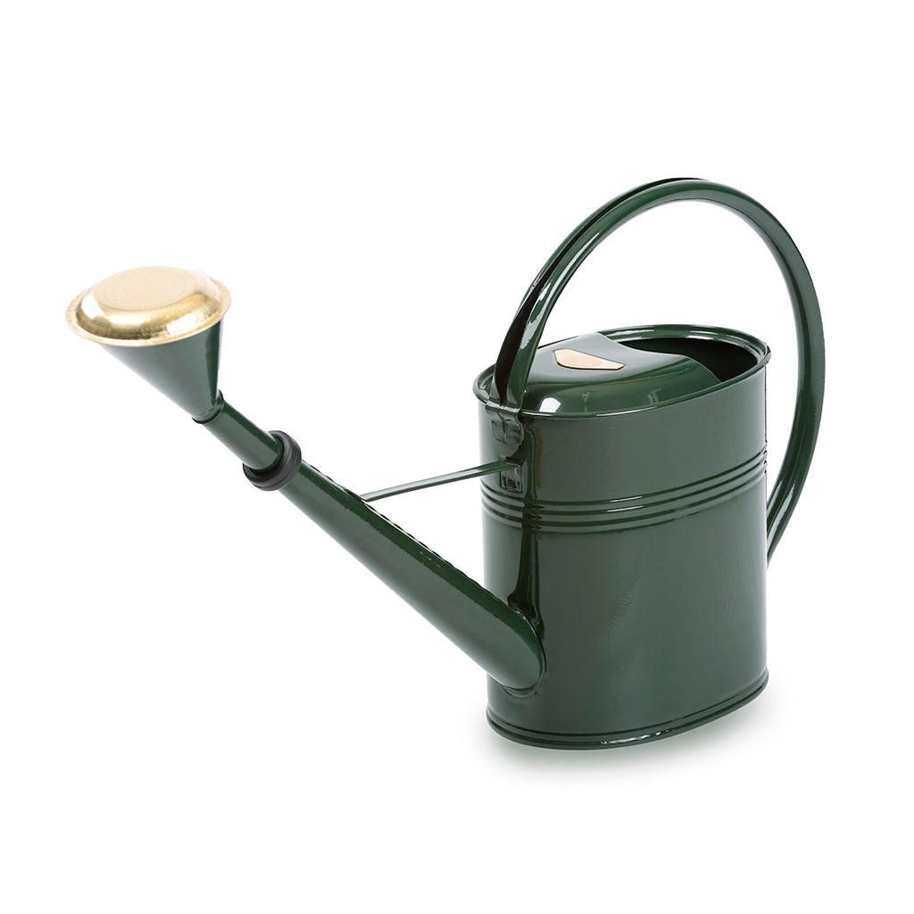 Mit dieser formschönen ovalen Gießkanne macht das Blumengießen gleich viel mehr Spaß! Mit ihrem Fassungsvermögen von 8 Litern Wasser ist die Gießkanne auchfür größere Beete geeignet. Dank der abnehmbaren Brause kannst Du punktgenau gießen. Die Gießkanne ist feuerverzinkt und pulverbeschichtet, was der Oberfläche seine typische, leicht unebene Struktur verleiht. Der glänzende Goldton des Messingteils der Brause verändert sich aufgrund der Luftfeuchtigkeit und dem Kontakt mit Wasser auf ganz natürliche Weise und bekommt mit der Zeit eine warme Patina, was der Brause einen rustikalen Charme verleiht.